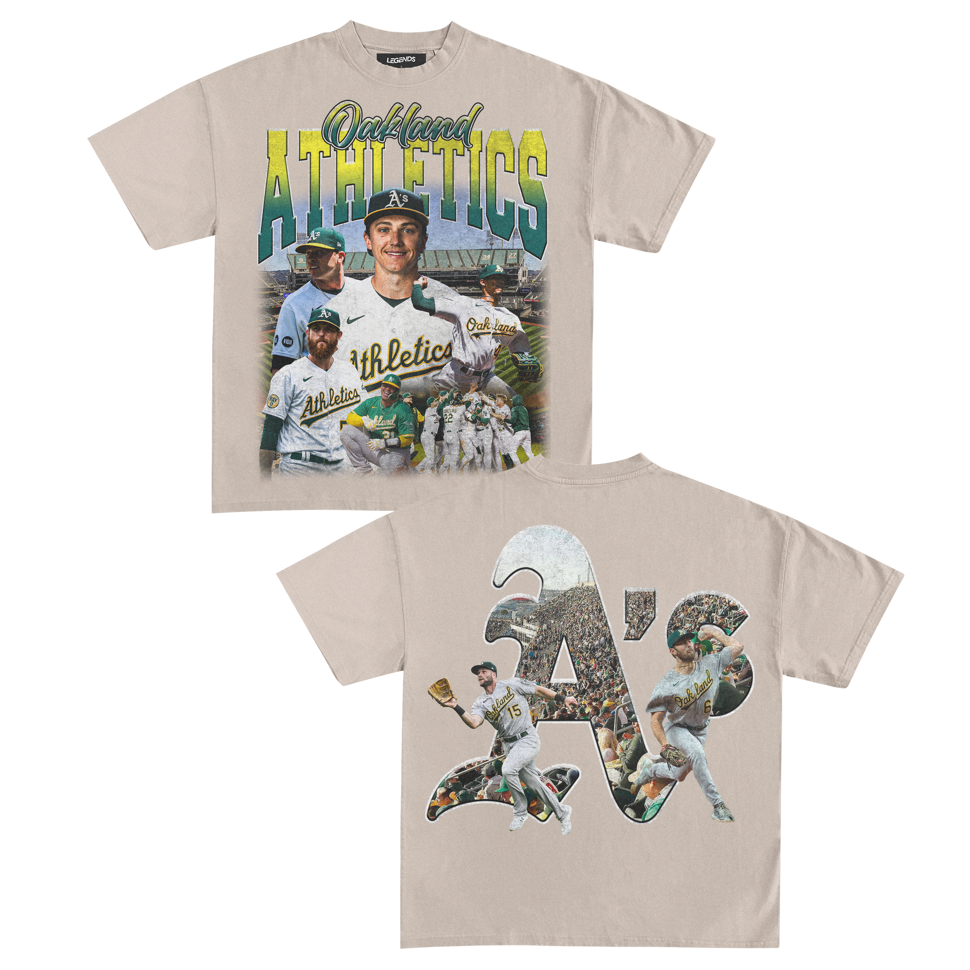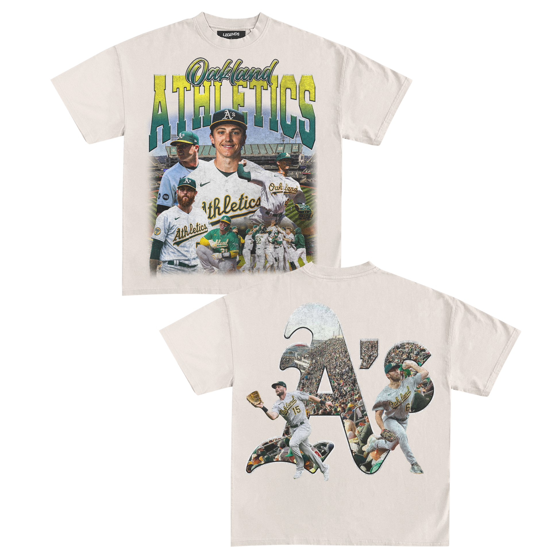 Elevate your street style with the power of the A's legacy, standin' tall with the legends. Show your love for the game and rep the best with this tee that's more than just clothing. It's a statement of loyalty and a salute to the dedicated fans that bleed green and gold.