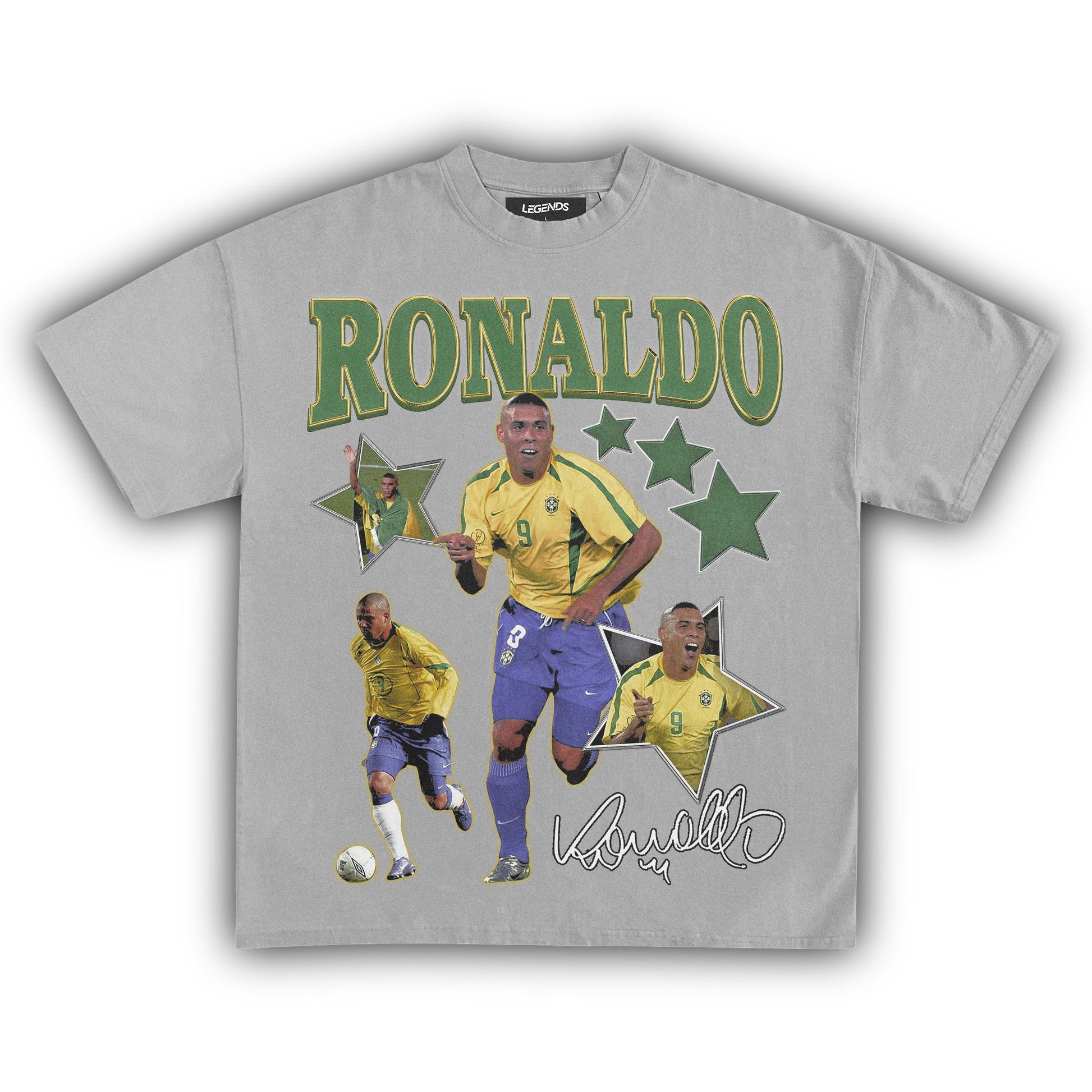 Show off your love for the beautiful game and its legends with this Ronaldo Luís Nazário de Lima vintage heavyweight tee. Dubbed 'O Fenômeno,' Ronaldo's impact on soccer is beyond compare, and this shirt encapsulates the flair, power, and pure talent that define one of Brazil's greatest exports.